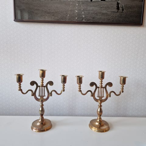 Två kandelabrar i mässing med sten i mitten. Säljs som par, 520 kr för bägge