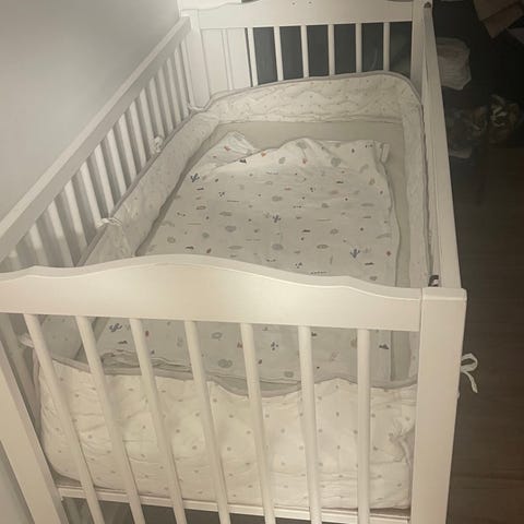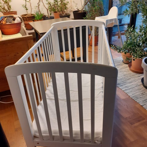 Klassisk vit spjälsäng. Man kan ställa botten i två olika lägen.