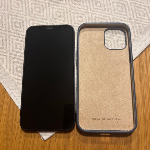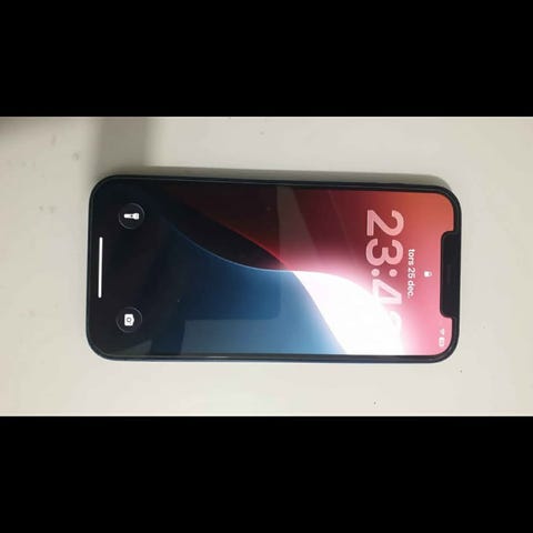 Apple iPhone 12 med 128 GB lagringskapacitet i svart färg. Mobiltelefon med pekskärm och bakre kamera. Modell med flera appar installerade, inklusive mail, kalender och kartor.