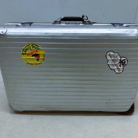 Använt skick, se bilder. Finns en hel del bucklor (vilket det i min mening ska på en Rimowa). Två lås med tresiffrig kod. Fint retro tyg på insidan. En av de bruna banden på insidan saknas samt att det finns ett mindre hål i tyget. Spricka i plasten vid ena hjulet.
