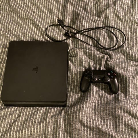 Sony Playstation 4 spelkonsol i svart färg. Inkluderar en handkontroll och nödvändiga kablar för anslutning. Enheten har HDMI-port och nätverksport för anslutning till internet och TV.