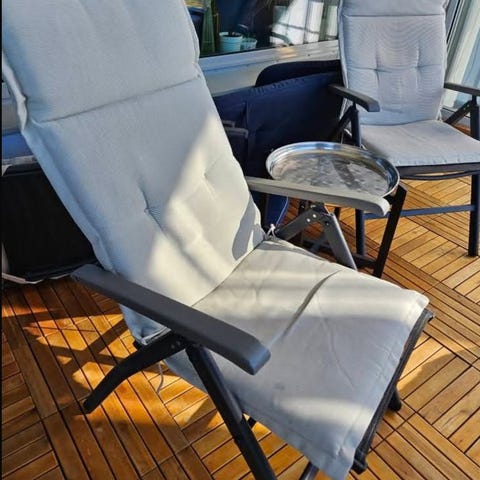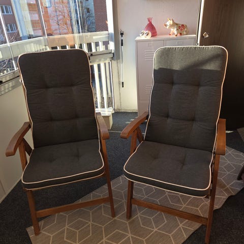 2 st solstolar som knappt är använda. Dynorna är i blått, vitt och grått. Dynorna är goa att sitta eller ligga på.