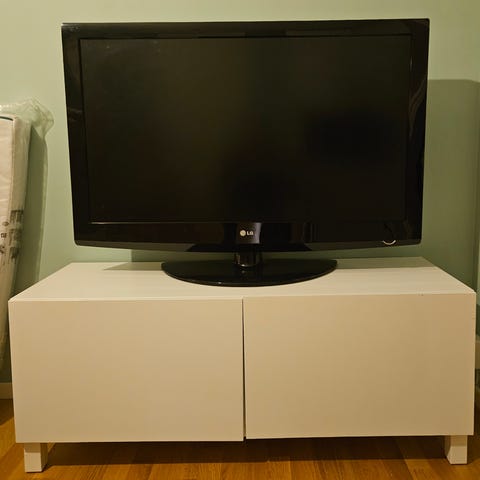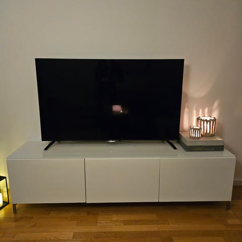 Säljer en stilren och rymlig vägghängd TV-bänk bestående av 5 st BESTÅ-skåp och 5 st BJÖRKÖVIKEN dörrar från Ikea.