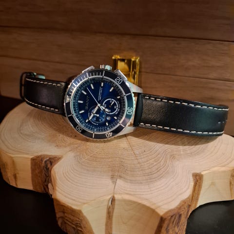 Stilren GANT St. James armbandsur med svart läderarmband och blå söm. Klockan har en silverfärgad urtavla med datumvisning och en liten sekundvisare. Boetten är tillverkad i rostfritt stål och har ett vattenskydd på 10 ATM. Klockan drivs av ett japanskt urverk.