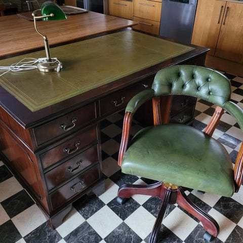 Säljer ett välbevarat engelskt skrivbord i idegran. Brunt läderklädd skrivyta med guldkant som är i mycket fint skick. Handtag i mässing.