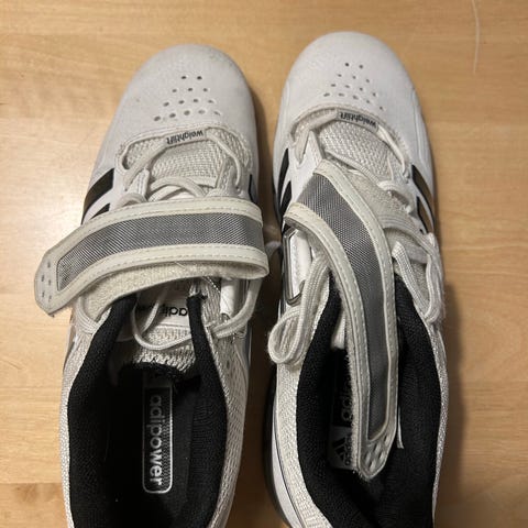Adidas lyftarsojor i storlek 43 1/3. Vita med silver och mesh. Stabila som fan och med snabbstängningsmekanism och vajerspänne som gör att du står som gjuten i marklyft och knäböj. Maxat 180 kg i mark. Skorna klarar myyycket mer!