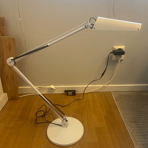 Modern skrivbordslampa med rörlig arm och vridbar ljusstråle nypris c:a 2000:- säljes för 700:- hämtas i Stockholm