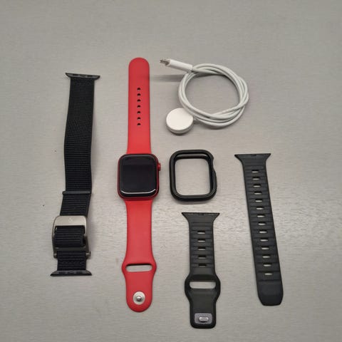 Säljer en Apple Watch Series 7 i svart aluminium, GPS + Cellular (röd ring på kronan). Kan användas fristående för samtal, meddelanden och data utan iPhone i närheten.