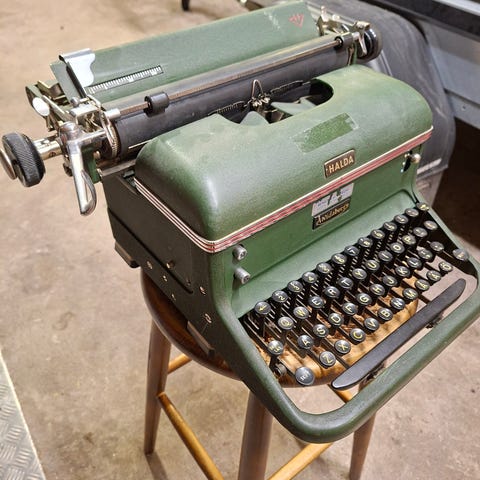 Jervi Type 60 skrivmaskin med tangentbord och pappersmatningsmekanism. En mekanisk enhet för manuell textinmatning och utskrift på papper.