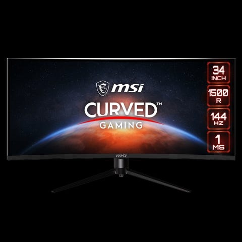 MSI Optix MAG342CQR 34-tums skärm med ultrabred 3440x1440 upplösning, 1500R böjd panel och 1 ms responstid. Skärmen har HDR-stöd och är lämpad för spel och multimedia.