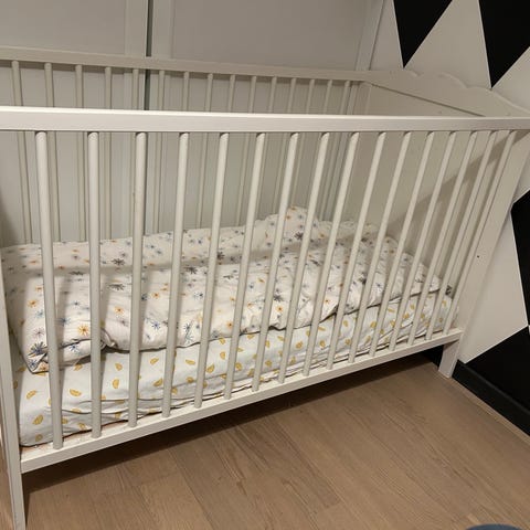 IKEA spjälsäng i grå färg. Sängen är utformad för små barn och har två lådor under för förvaring. Tillverkad i trämaterial.