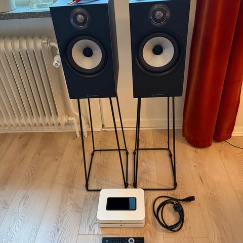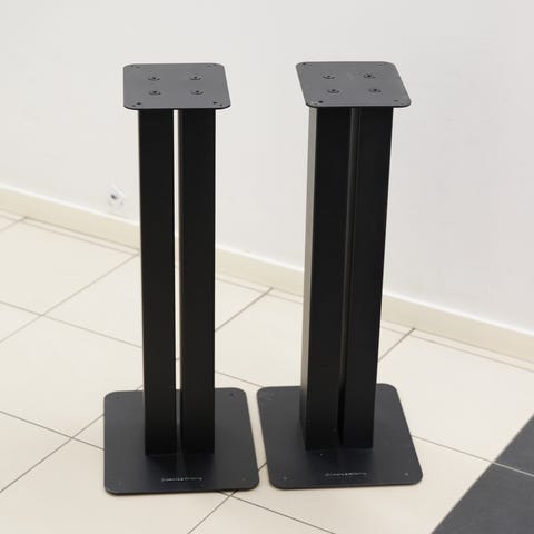 Bowers & Wilkins högtalare i svart trä med stativ. Designad för ljudåtergivning och passar för hemmaljudsystem eller liknande användningsområden.