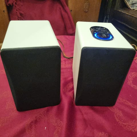 Argon Creative Pebble 2.0 datorhögtalare i vitt utförande. Högtalarna är runda med en diameter på cirka 10 cm och har en USB-anslutning. De är designade för användning med datorer.