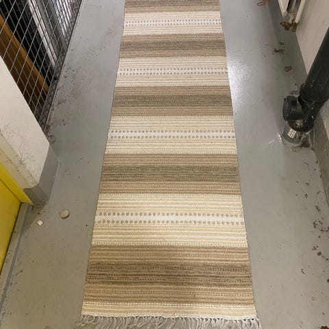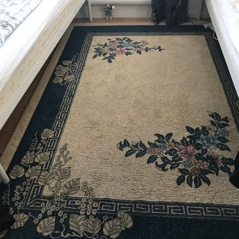 Fin och dekorativ matta i blå och beige färg med orientaliskt mönster och fransar. Passar bra i vardagsrum, sovrum eller som prydnadsmatta. Ger rummet ett varmt och elegant intryck.