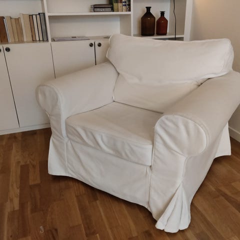 IKEA Ekolsund, Gunnared vilfåtölj i ljust brunrosa tyg. Vilfåtöljen kan ställas in i tre lägen - upprätt, lätt bakåtlutad och liggande viloläge - och enkelt anpassas till olika aktiviteter hemma. Klädseln är lätt att hålla ren eftersom den är avtagbar och kan tvättas i maskin. Otroligt bekväm fåtölj med en modern, enkel design. Nypris 3995kr.