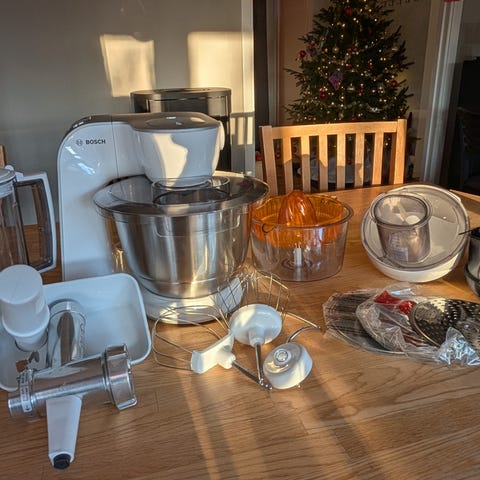Bosch köksmaskin med rostfri bunke och transparent plastlock. Utrustad med flera hastighetsinställningar för olika matlagningsbehov.