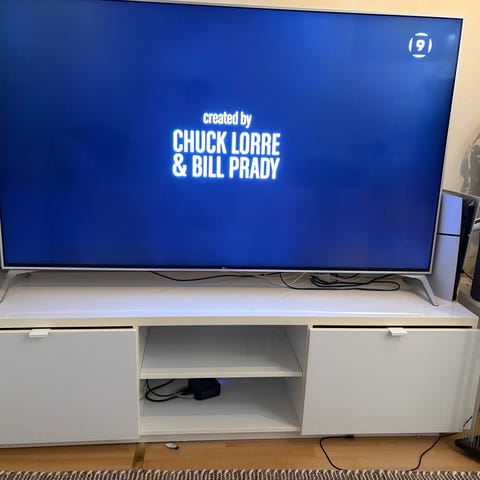 Tv bänk i bra skick har gjort ett litet slarvigt hål som man kan dra sladdar igenom