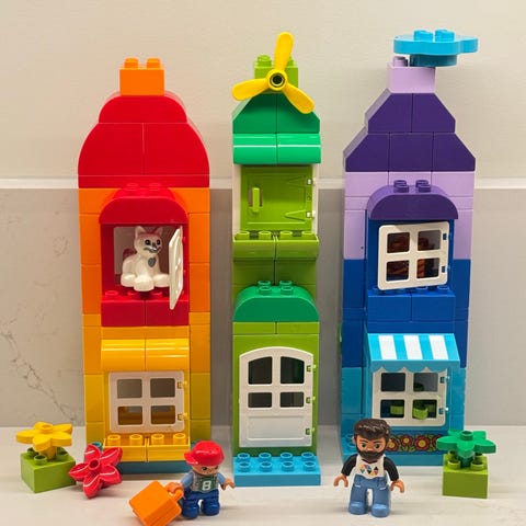 LEGO DUPLO byggklossar i olika färger och former. Setet innehåller flera klossar av varierande storlek och design, anpassade för yngre barn.