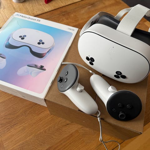 Oculus Quest 3s VR-headset i vit färg. Inkluderar headset och två handkontroller. Pluss ett tillbehör för vapen spel