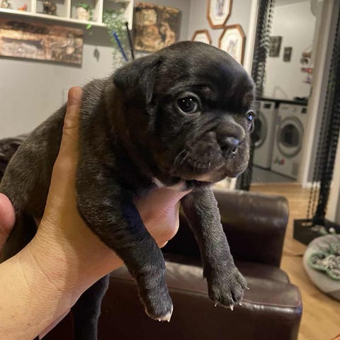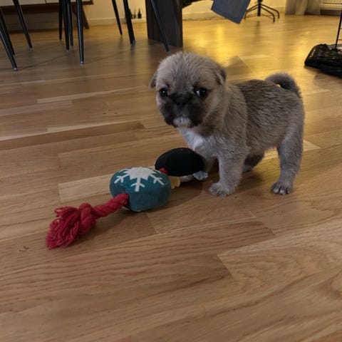 Givetvis finns deras mamma att träffa. Hon är en frisk och hälsosam mops med en lite sportigare kropp och åt det lite aktivare hållet även om hon gärna kan tillbringa en dag i soffan under en filt. Pappan är en renrasig mops men som inte har stamtavla, varför också valparna inte har de. Men det är två renrasiga mopsvalpar.