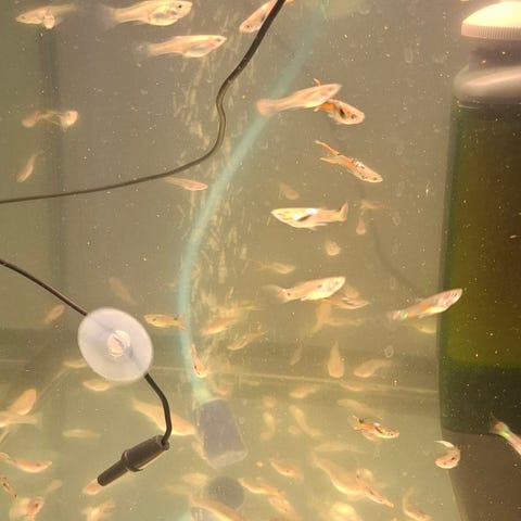 • Fiskar: 10 stycken pigga och färgglada Guppy-fiskar.