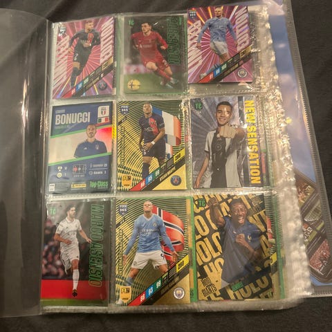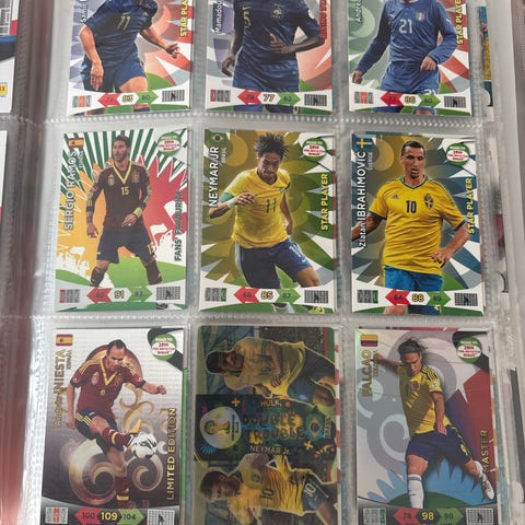 Panini Match Attax fotbollskort, 4-pack med olika spelarkort. Kortens framsida visar spelare med olika design och statistik, baksidan har matchinformation och logotyper. Kortens storlek och material är standard för samlarkort.