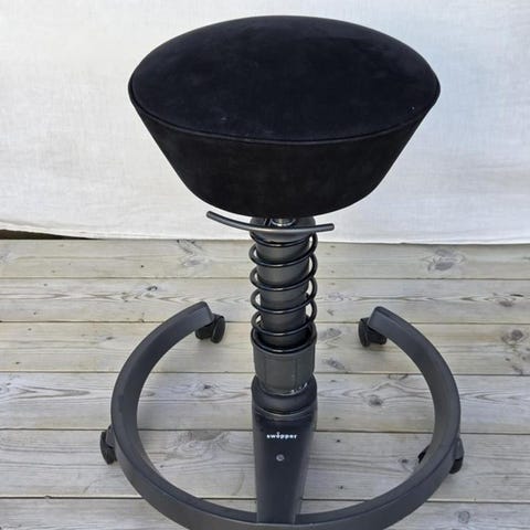 Säljer en höj- och sänkbar arbetsstol/ståstol med rund fot och mjukt, ergonomiskt format säte.