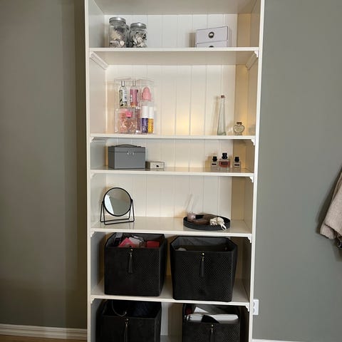 Bokhylla i massiv ek med mycket förvaring i gott skick. 4 förvaringskorgar medföljer.