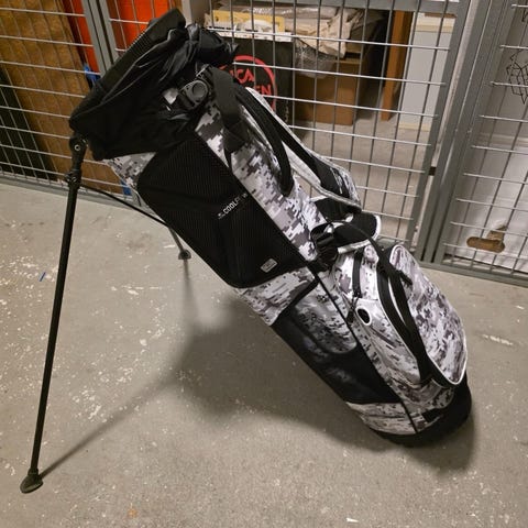 Cobra Golfbag i svart och grå färg med flera fack för förvaring. Golfbagen har bärremmar för enkel transport och ett handtag upptill. Den är utformad för att hålla golfklubbor organiserade och lättåtkomliga under spelet. Det är inget fel på den, allt ser ut och fungerar som de ska.