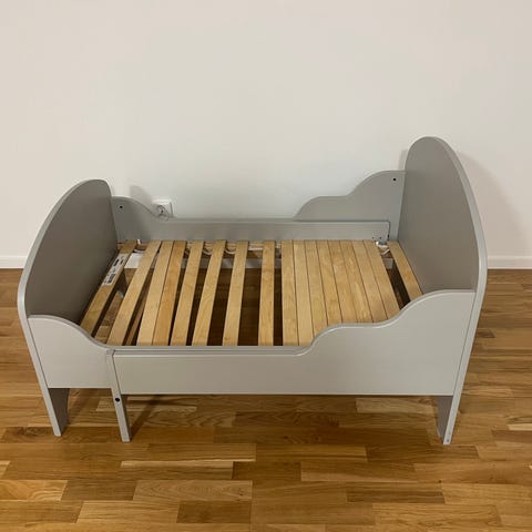 Få synliga beslag, mjuka kanter och urfrästa handtag gör sängstommen stilren och säker.