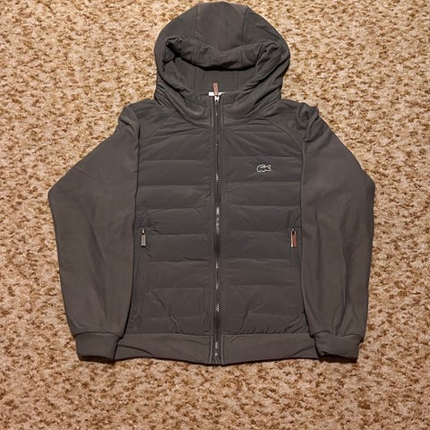 Lacoste jacka i färgerna brun, svart och grön. Jackan har en huva och dragkedja.