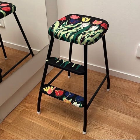 En fin pall med svart ben och ett vackert mönstrat tyg. Anakreon Josef Frank Svenskt Tenn. Perfekt som extra sittplats eller som en dekorativ detalj i hemmet.