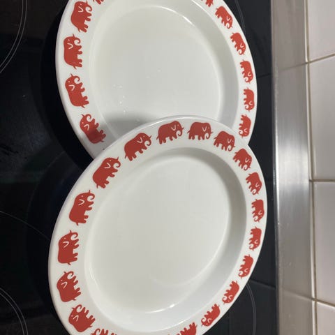 Fint skick! Den silvriga kanten är lite dov på olika ställen se bilder. Finns små repor på en av assietterna.