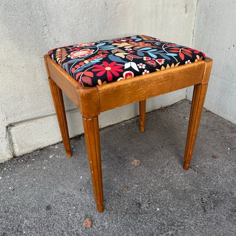 En retro pall med massiv träben och ett mönstrat lin tyg på sitsen,Svart ”Teheran” Josef Frank Svenskt Tenn.