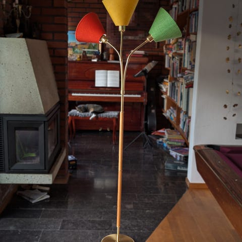 Vintage Golvlampa Teak Mässing Lampskärm Svart Tulpaner Josef Frank Svenskt Tenn