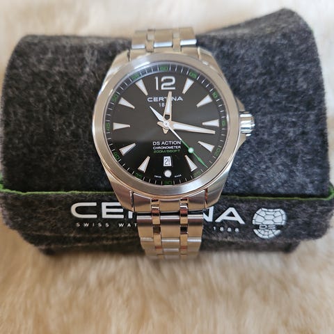 Certina herrklocka med metallarmband och blå urtavla. Klockan har en roterande bezel och kronograffunktioner.