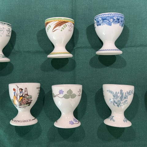 2 blå äggkoppar i riktigt fint skick, inga krackeleringar eller nagg. Det finns ojämnheter i överkanten på den ena från tillverkningen. Titta noga på bilderna.