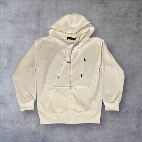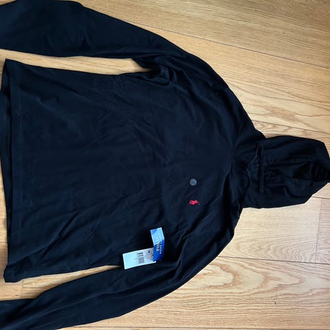 Ralph Lauren huvtröja för herr i storlek M, svart färg och tillverkad i bomull. Tröjan har huva och dragkedja framtill, den är använd men ganska sparsamt.