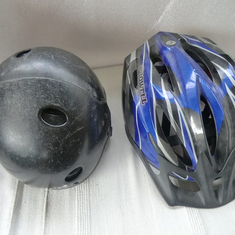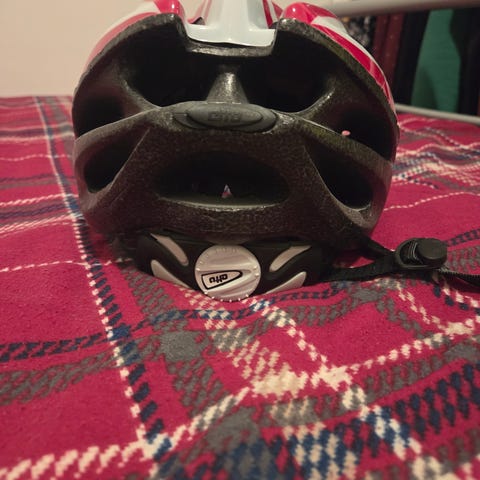 Cykelhjälm röd, vit och blå med ventilationshål