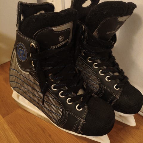Revolution ishockeyskridskor i storlek 40. Skridskorna är avsedda för ishockey och har en svart design med blå detaljer.