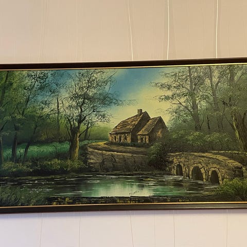 Signerat landskapsmålning med motiv av träd och vatten i en dekorativ ram. Målningen visar en naturscen med detaljerade träd, vatten och stenpartier. Passar för väggdekoration i hem eller kontor.