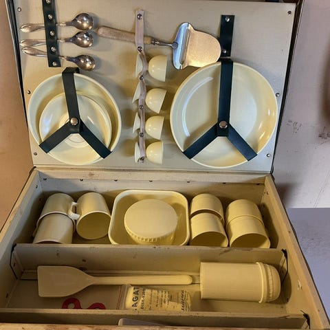 Vintage rottingväska med rutigt foder i rött och vitt. Väskan har flera fack och spännen för förvaring och säkerhet. Passar för picknick eller som dekorativ förvaringsväska.