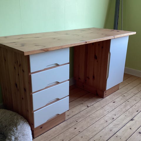 Ett retro skrivbord i trä med förvaring. Perfekt för hemmakontoret eller studierummet. Praktiskt och funktionellt.