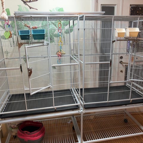 Metallbur för fåglar med flera trappstegar inuti. Burens design inkluderar en böjd topp och flera små dörrar för tillgång. Passar för små till medelstora fåglar.