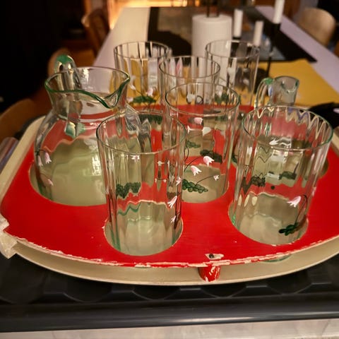 Består av flera märkta lådor såsom risgryn, strösocker, havregryn, salt, mjöl, potatismjöl, bitsocker, frukt samt kryddor (kanel, nejlikor, kardemumma m.fl.). Klassisk grön/vit färgsättning – ikonisk svensk kökshistoria.