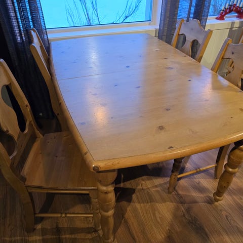 Matbord i felfritt skick, 108x100 cm. 2 iläggskivor på 50 cm ingår. Maxlängd på bordet 280 cm.