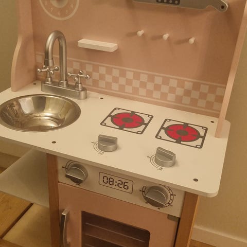 Flera kökstillbehör såsom plastgrönsaker m.m. och köksredskap medföljer.