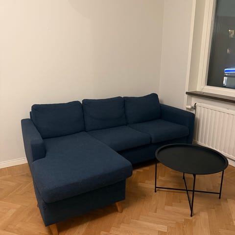 Fin blå soffa och tillhörande puff säljes. Ca 210 bred, 90 djup, 70 hög. Tvättbar klädsel runt sitt- och ryggkuddarna.