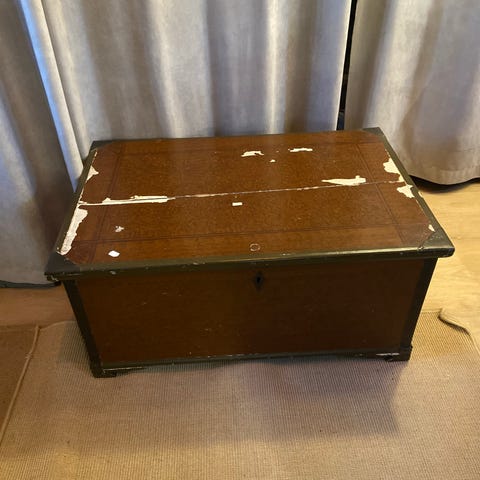 Gammal skattkista, möjligen tillhörande Rackham den Röde, som målats om. Riktigt härlig patina. Alla metallbeslag är intakta. Ingen nyckel finns.