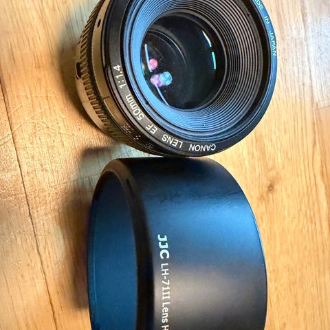 Canon EF 50mm f/1.4 objektiv med fast brännvidd, svart färg och kompatibelt med Canon EOS-kameror. Objektivet är tillverkat i plast och metall och är lämpligt för porträtt och allmän fotografering.
